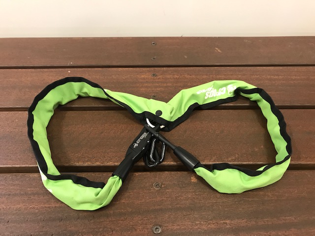 普通のチェーンロックと違い、チェーンの真ん中にリングが付いています。もちろん1本のチェーンロックとして使用できますが、そのリングにより1本のチェーンロックで輪を2つ作る事ができます。