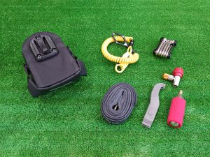 携帯工具、チューブ交換セット(予備チューブ1本、タイヤレバー、インフレーター1本)、ワイヤーロック