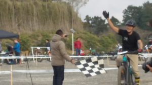 いよいよ、3時間の耐久レースも大団円。主催者の振るチェッカーフラッグ脇を、やり切った笑顔でゴール。