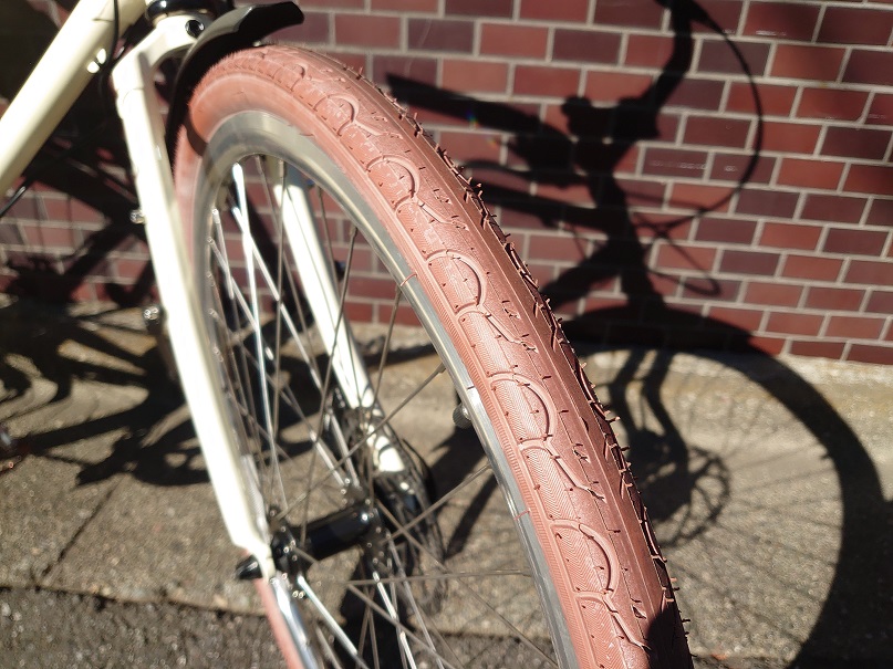 サドル同様、車両のアソートカラーになるブラウンの街乗り向けタイヤ。余計な凹凸がないので快適な乗り心地です。