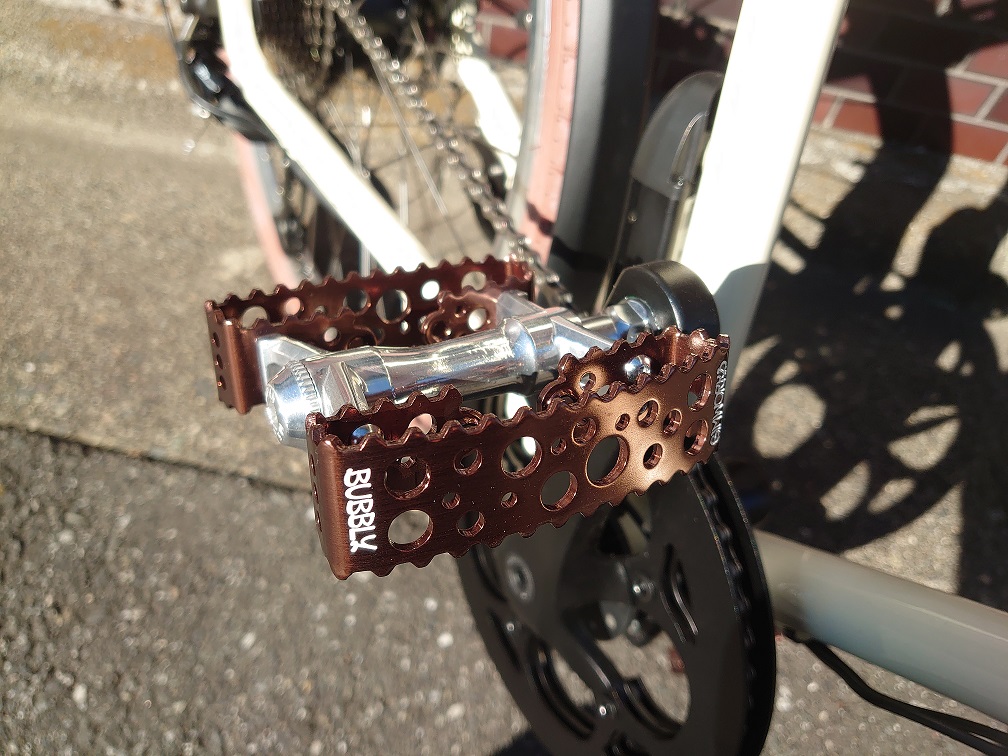 ブロンズカラーがアイボリーの車体にベストマッチします。特徴的はデザインながら、広い踏み面、確かな回転性能を持つペダルとなります。