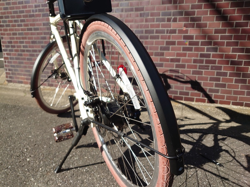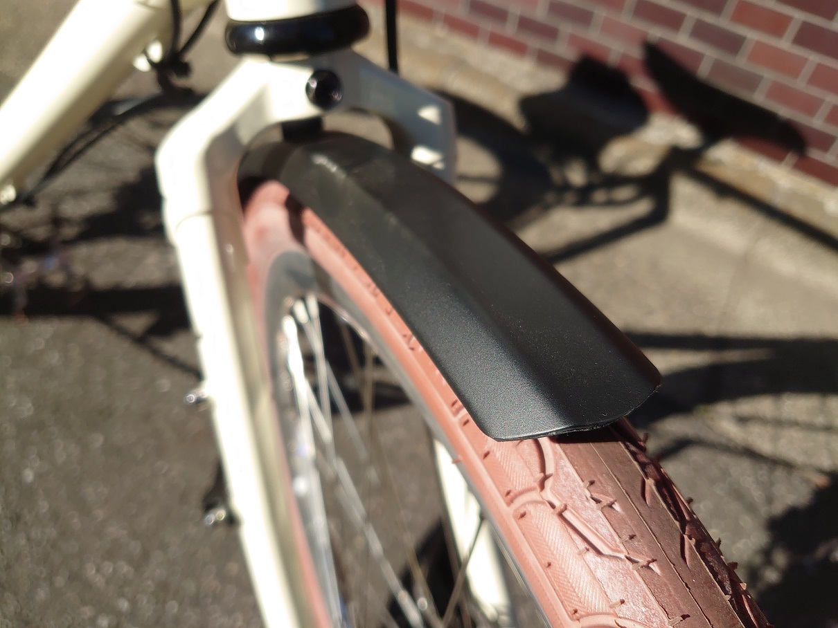 サドル同様、車両のアソートカラーになるブラウンの街乗り向けタイヤ。余計な凹凸がないので快適な乗り心地です。