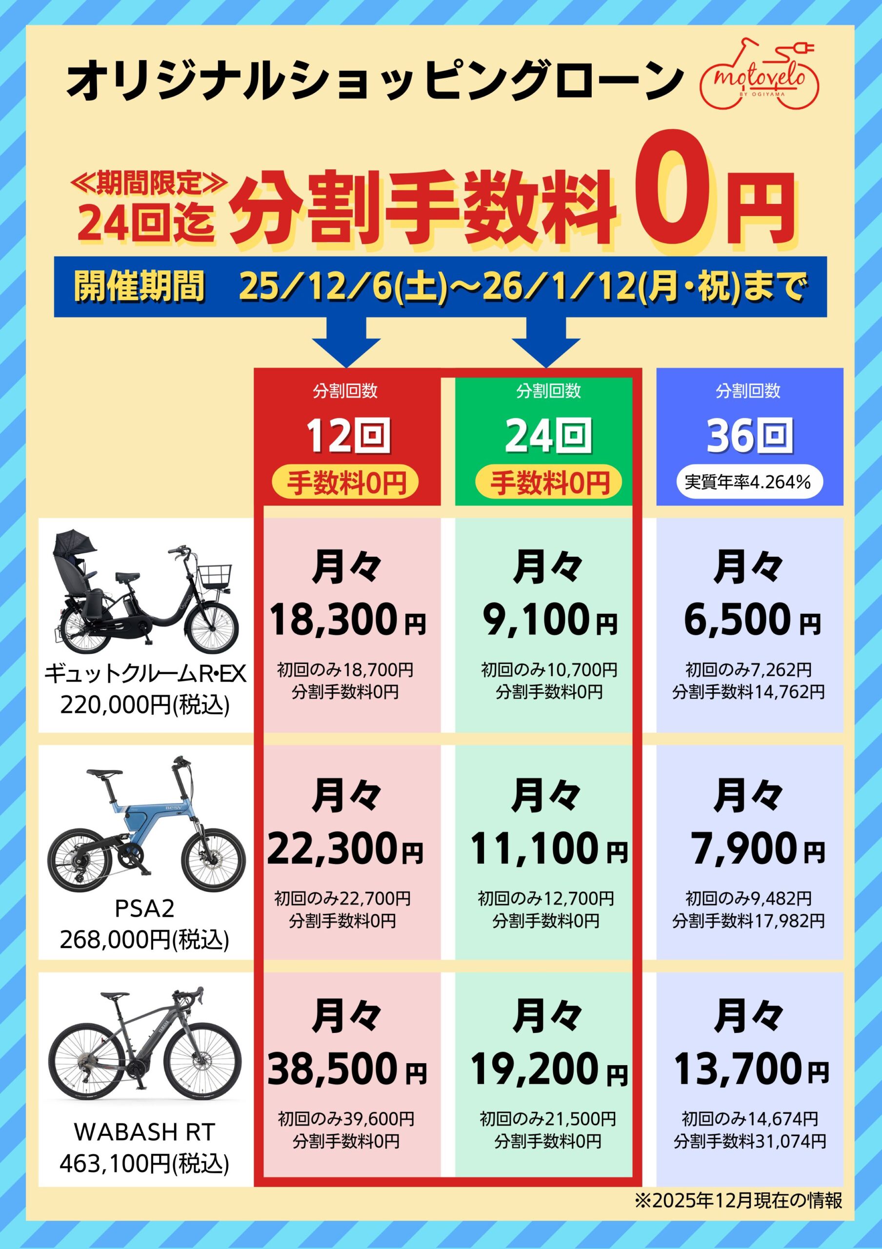 通常12回までのお支払いを金利手数料0円でご案内しておりますが、期間限定で、24回まで拡大の特別金利キャンペーンを開催します。子乗せモデルからe-bikeまで車種問わずご利用いただけます。