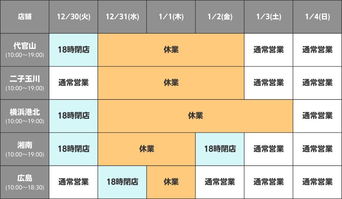 年末年始の営業時間ですが、下記の通りとさせていただきます。お客様にはご迷惑をおかけいたしますが、何卒ご理解のほどよろしくお願い申し上げます。